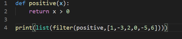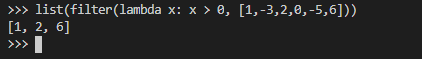: 첫 번째 인수로 함수 이름을, 두 번째 인수로 그 함수에 차례로 들어갈 반복 가능한 자료형을 받는다. 그리고 두 번째 인수인 반복 가능한 자료형 요소가 첫 번째 인수인 함수에 입력되었을 때 반환 값이 참인 것만 묶어서 돌려준다.