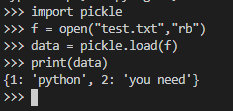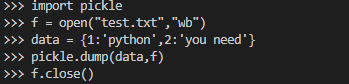 위에서 test.txt로 딕셔너리 형태로 저장했다. pick.dump()를 사용해 딕셔너리 형태로 저장후 종료