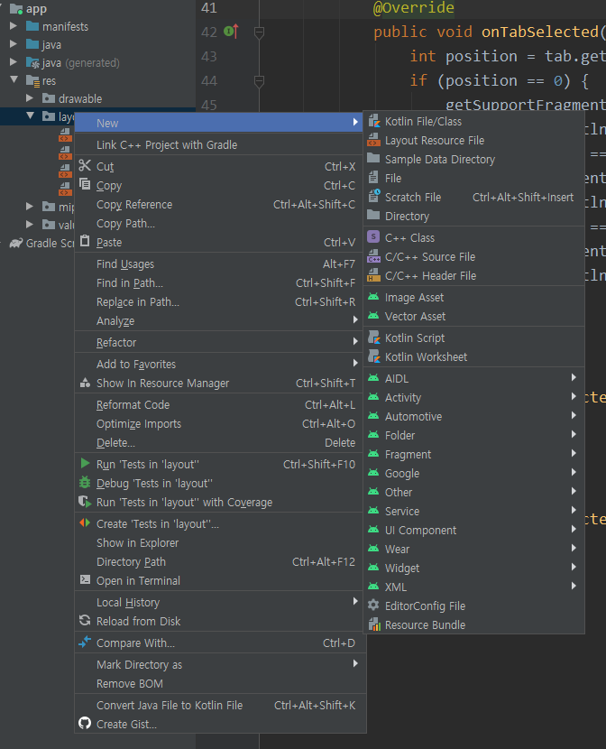 app/res/layout 에서 우클릭 후 new -> layout resource file 클릭후 프래그먼트 생성