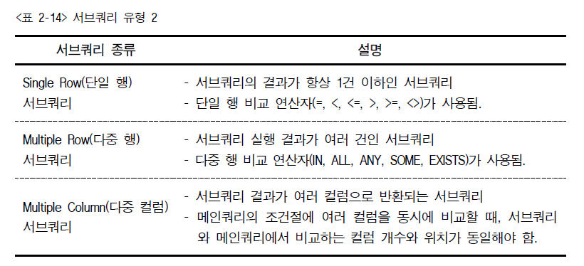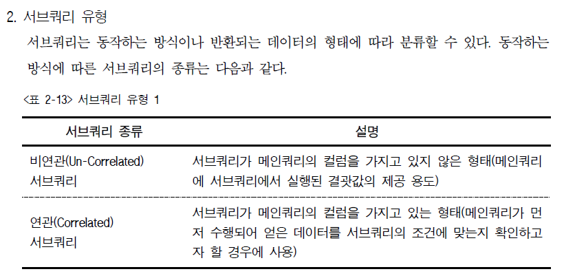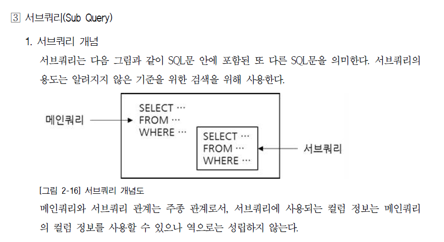 서브쿼리 - SQL문 안에 포함된 SQL문 형태의 사용 기법