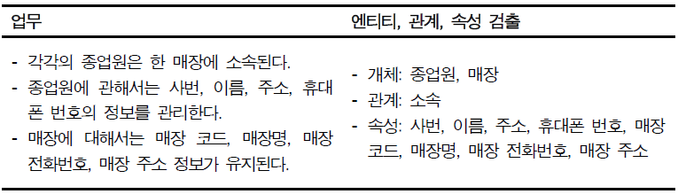 업무나 시스템을 분석하여 엔티티, 속성을 추출한 뒤 테이블을 작성한다.