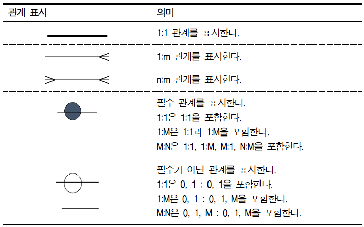 두 엔티티 간의 관계를 정의한다. 개체는 사각형(□), 속성은 타원형(○)을 이용하여 표시하며, 관계 표시는 아래 표를 보자!
