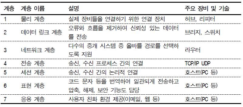 국제 표준화 기구인 ISO에서 개발한 네트워크 계층 표현 모델이다. 각 계층은 서로 독립적으로 구성되어 있고, 각 계층은 하위 계층의 기능을 이용하여 상위 계층에 기능을 제공한다. 1계층인 물리 계층부터 7계층인 애플리케이션 계층으로 정의되어 있다.