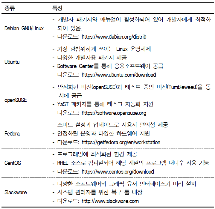 오픈소스 기반의 리눅스와 유닉스는 개발사 및 제공 업체가 다양하며 리눅스는 Redhat, 페도라, 센트OS와 같은 Redhat 계열과 데비안, 우분투, 칼리, 라즈비안과 같은 데비안 계열 그리고 기타 리눅스 등으로 구분된다. 각 리눅스별 특징과 차이점이 있으므로 표의 특징과 Link를 참조하여 최적화된 운영체제를 선택한다.