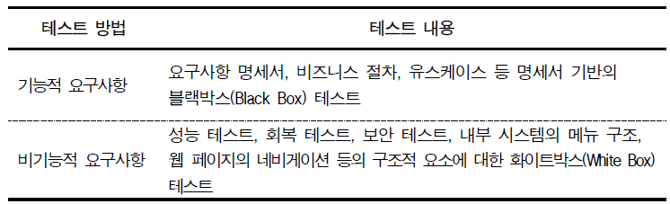 단위 테스트는 구조 기반과 명세 기반 테스트로 나누어지며, 표 와 같이 기본적으로 개발된 코드 및 모듈의 범위 내에서 정상적인 작동과 사용자의 요구사항 등을 테스트하는 데 목적이 있다.