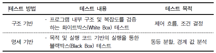 단위 테스트는 구조 기반과 명세 기반 테스트로 나누어지며, 표 와 같이 기본적으로 개발된 코드 및 모듈의 범위 내에서 정상적인 작동과 사용자의 요구사항 등을 테스트하는 데 목적이 있다.