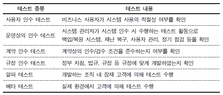 일반적으로 최종 사용자와 업무에 따른 이해관계자 등이 테스트를 수행함으로써 개발된 제품에 대해 운영 여부를 결정하는 테스트로, 실제 업무 적용 전에 수행한다.