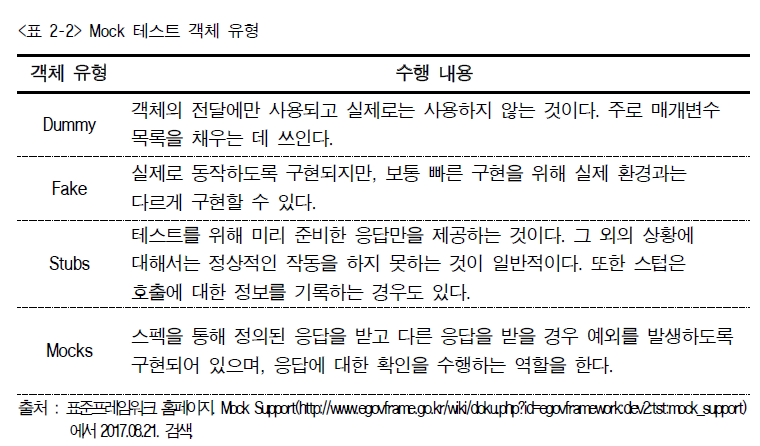 (나) 테스트 전용 객체를 테스트 더블 이라고 부르며, 이는 테스트를 위해 실제 객체를 대신해서 사용되는 용어이고 객체 유형은 표와 같다.