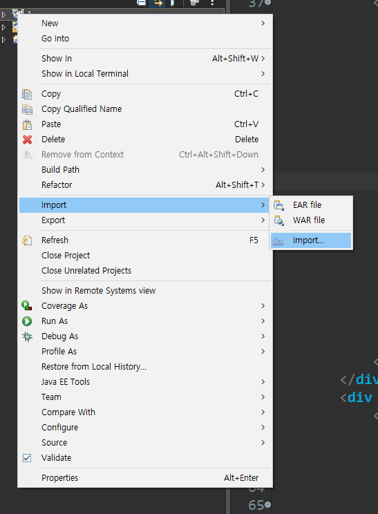 dynamic web project에 오른쪽 클릭 -> import -> import