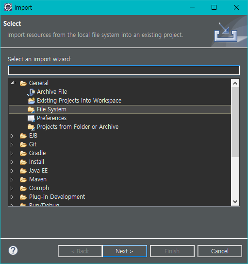 가져오기 원하는 파일들의 상위폴더 프로젝트를 폴더선택