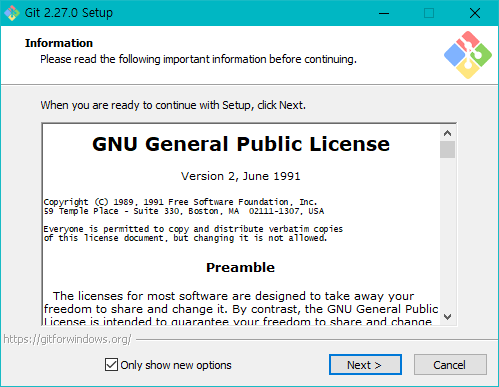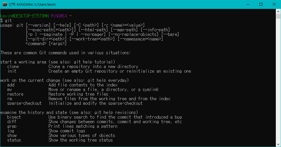git이라고 친후 여러 옵션이 표시되면 깃이 제대로 설치된거다.