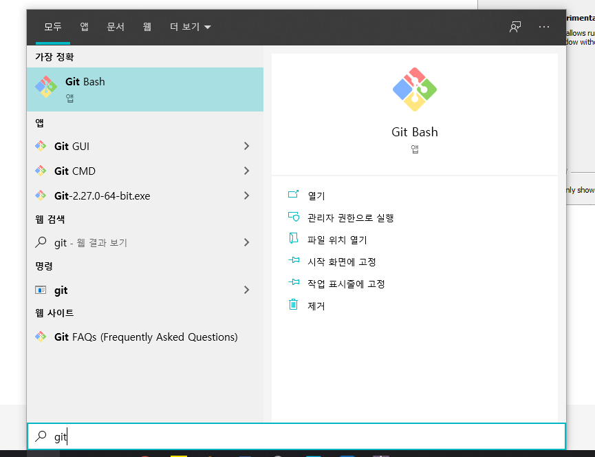 윈도우 탐색기에 git이라고 치면 git Bash가 깔려있다.